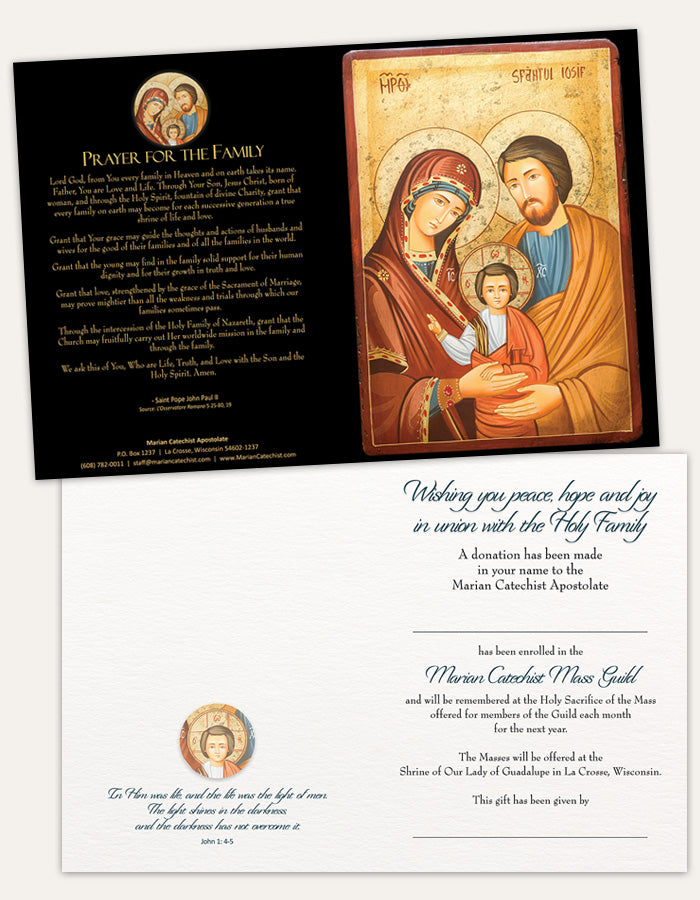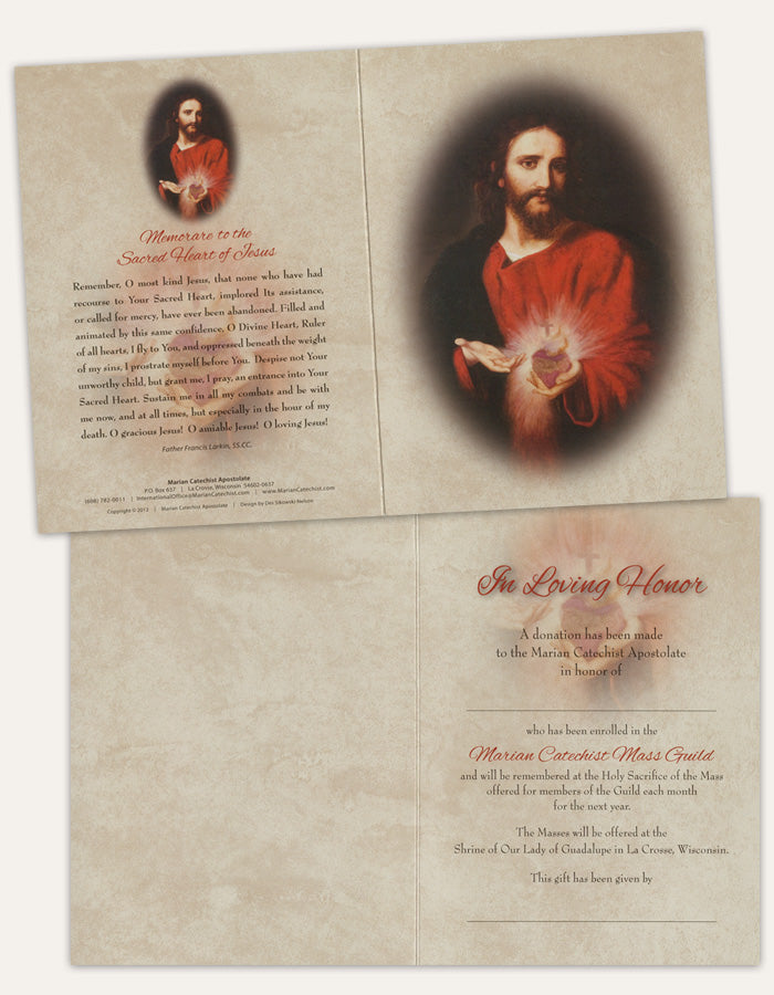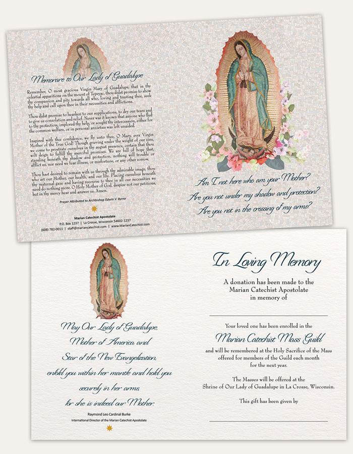 Your loved one has been enrolled in the Marian Catechist Mass Guild and will be remembered at the Holy Sacrifice of the Mass offered for members of the Guild each month for the next year.